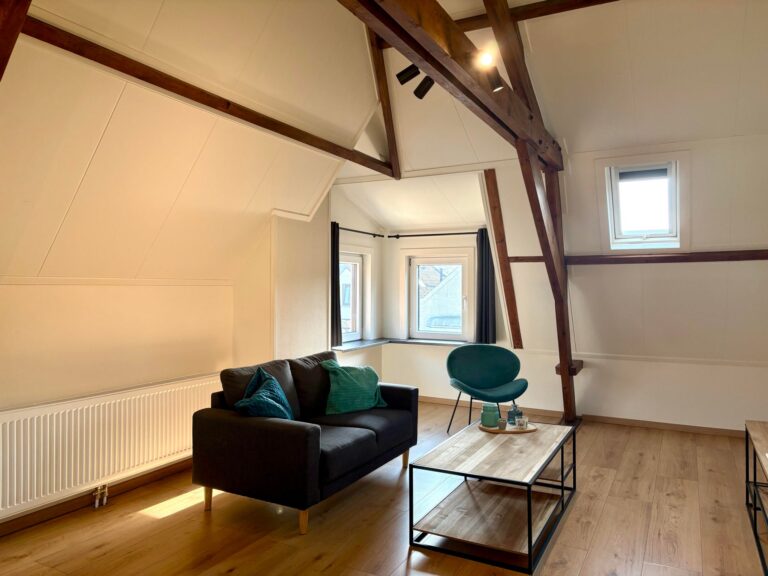 The very spacious and bright living room features large windows, a neat laminate floor, window coverings, and a beautiful beam construction that gives the apartment a lot of character. The open kitchen is modern and equipped with various built-in appliances, including a fridge-freezer, combi-oven, induction hob, extractor hood, dishwasher, and sufficient cupboard space.