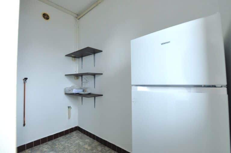Behind the kitchen is a practical storage space with washing machine connection and ample storage space. Here is also then also the refrigerator/freezer placed.