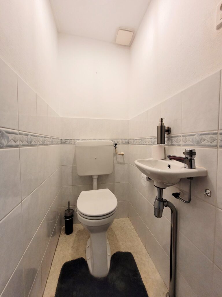 Next to the bathroom is a separate and beautiful toilet room which is equipped with a sink.