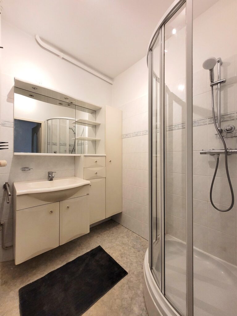 The bathroom is equipped with a shower stall with and thermostatic faucet. In addition to the shower, the bathroom is equipped with a sink with vanity unit, mirror and a practical storage cabinet.