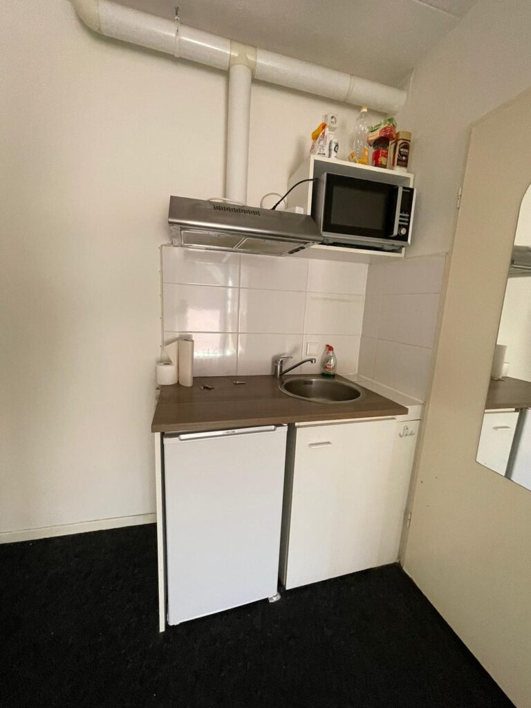 It is a studio on the third floor with a kitchen unit and bathroom included. The building is located on a street full of restaurants in the city centre. The entire studio is approximately 18 square metres in size. The address is shared with 3 housemates who also all have a studio. Shared utilities include the washing machine and dryer.
