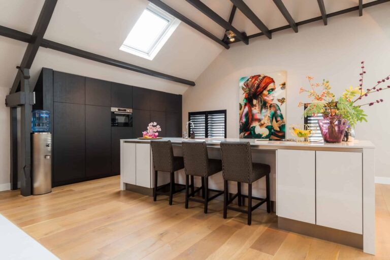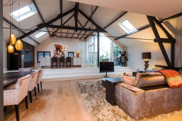 1st floor: via gate access to the spacious roof terrace. The roof terrace gives access to the loft entrance. Lovely reception hall equipped with a nice workplace, spacious seating area and generous dining table with 8 chairs. The kitchen can rightly be called an eye-catcher and offers a nice view over the living area. Also located here are two bedrooms and bathroom 1.