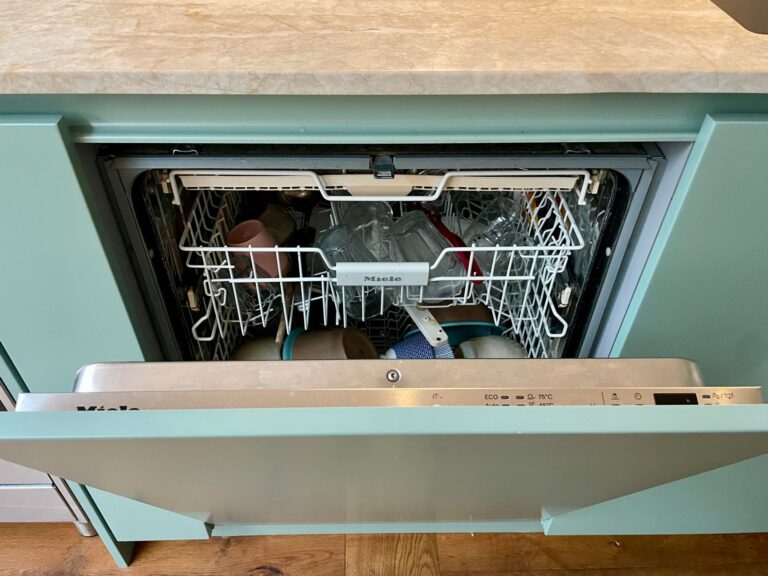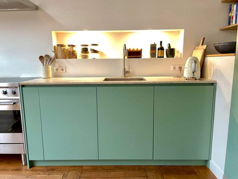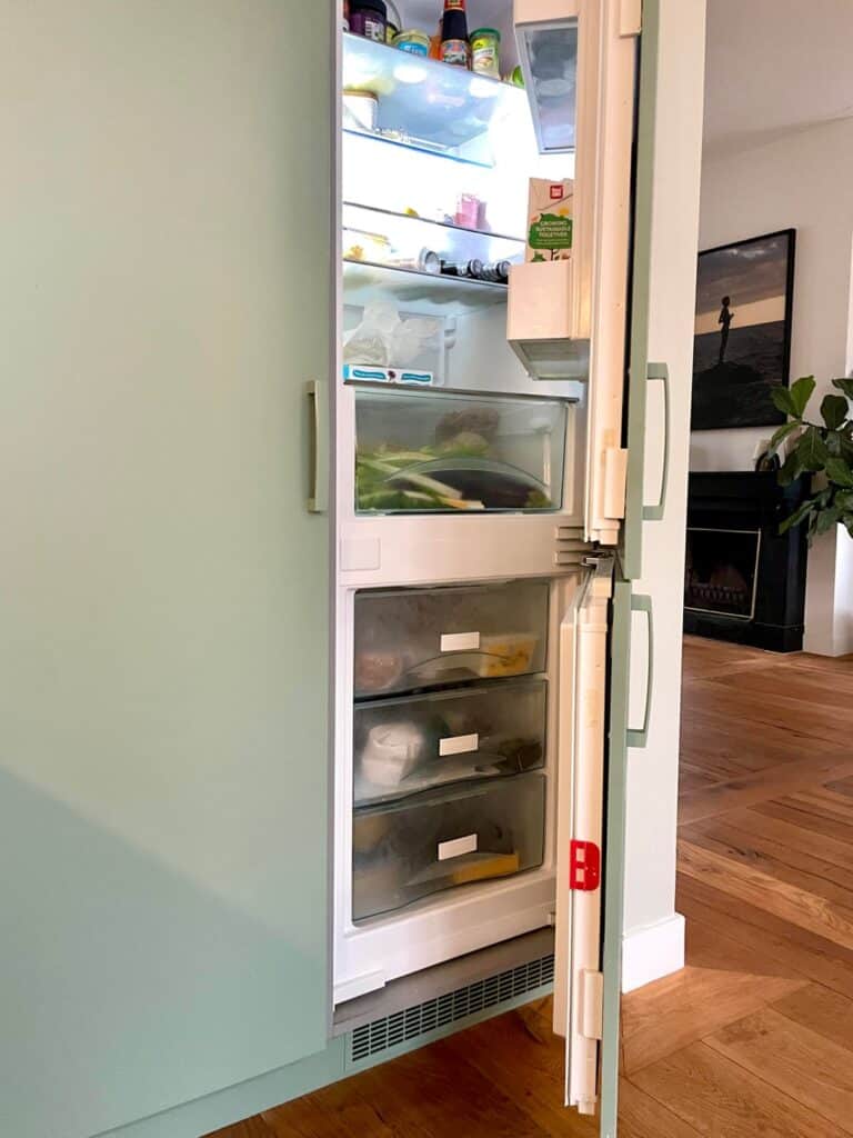 Spacious kitchen with a Nespresso machine, kettle, dishwasher, refrigerator, and freezer. Ample storage space in the kitchen.