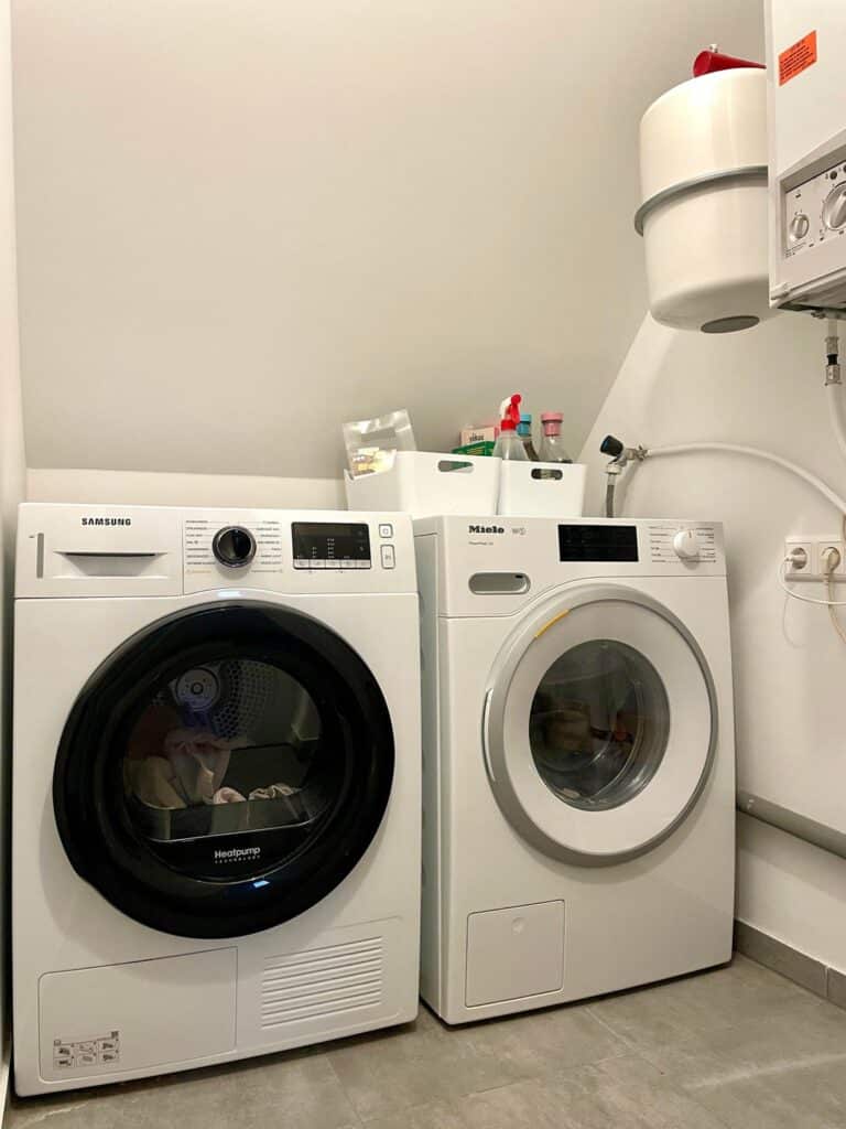 Laundry room with a washing machine, dryer, and central heating boiler.