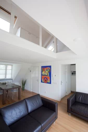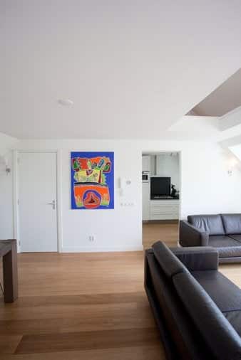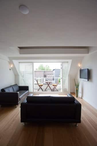 Very spacious and fully furnished living room with large windows which provides plenty of natural daylight. Through French doors you have access to the roof terrace, where you can enjoy the evening sun.