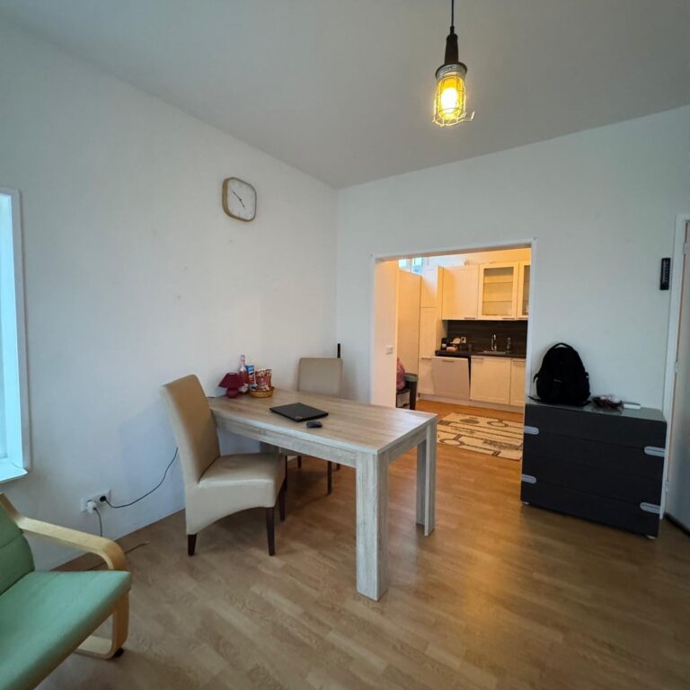 Entrance on the ground floor, with a staircase leading to the first floor where the entrance to the apartment is located. A long hallway provides access to all rooms in the apartment. Spacious and bright living room with open kitchen (approx. 38.5 m²), bathroom with shower, double washbasin with vanity unit and washing machine connection, bedroom (approx. 14 m²) with access to the outdoor space, and a separate toilet with a small sink.