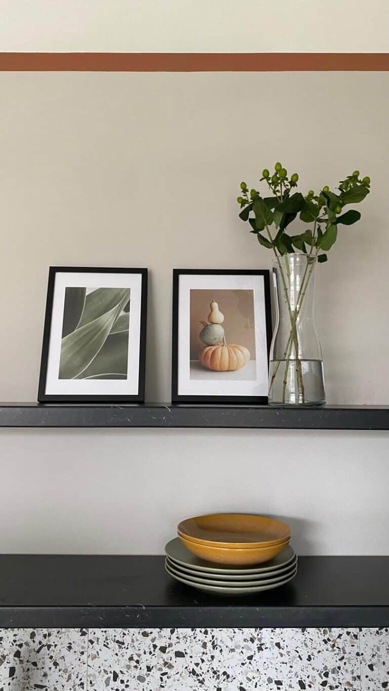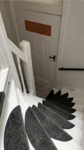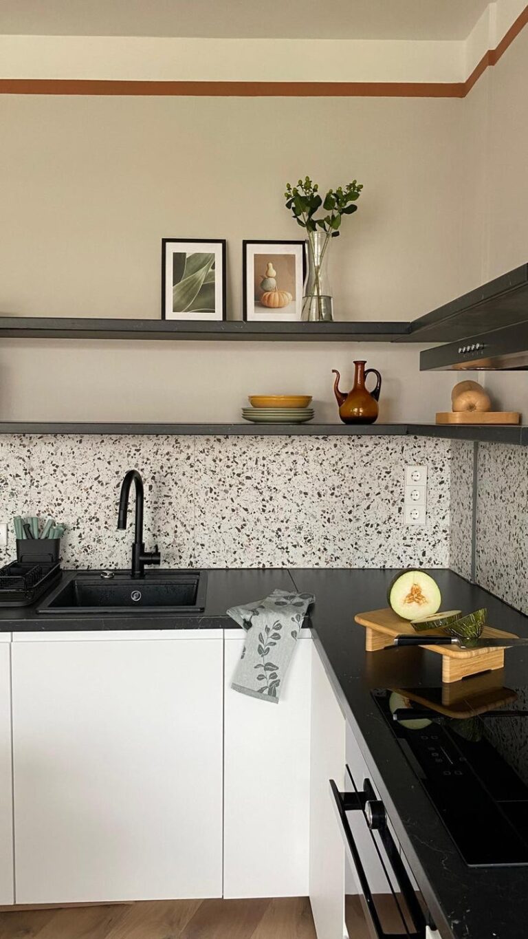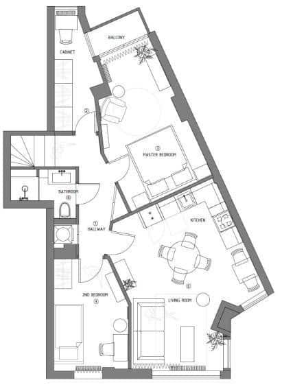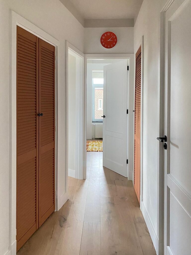 Layout; Main entrance on the ground floor, access via the stairs to the first floor. First floor: Front door with hall and stairs to the second floor, access to the cozy living/dining room via the hall. Open kitchen with built-in appliances, including fridge/freezer, combination microwave, dishwasher, induction hob, and extractor hood. Bathroom with shower cabin, sink, and toilet. In the hall is a closet with the washing machine and dryer. Two bedrooms, one of which has access to the balcony. Walk-in closet/workspace with access to the balcony.