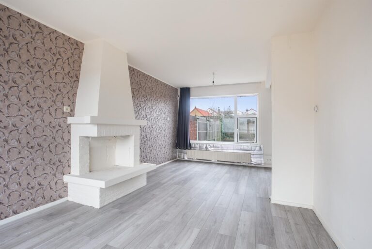 Spacious and sunny living room with open kitchen, (L-shaped) with decorative fireplace, laminate flooring and access to the rear garden. The kitchen has a simple layout with an extractor hood and sink as well as various cupboard space and connections for both a hob and (combi) oven.