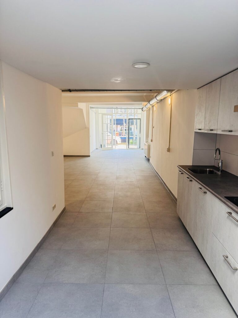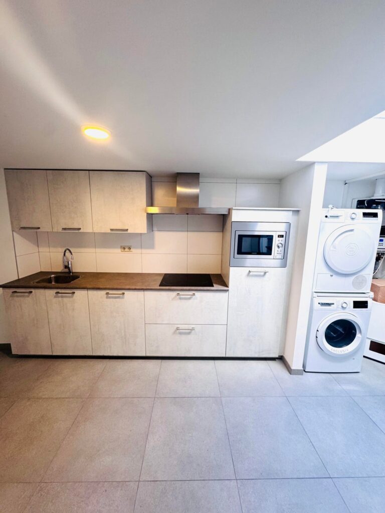 Entrance with hall and access to the spacious studio. A space has been created at the rear as a sleeping area. Also at the rear the kitchen with combi oven, induction hob, extractor, fridge with freezer and a dishwasher.