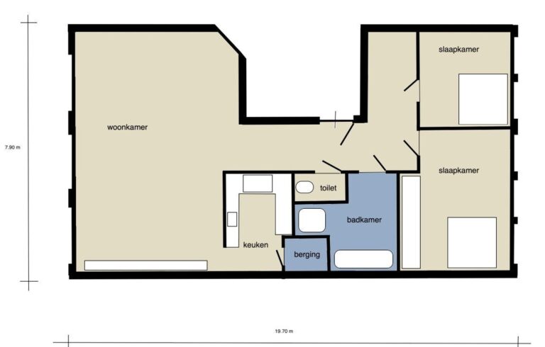 Two spacious bedrooms (approx. 16 and 13 m2) with enough space for a spacious wardrobe, a smaller third bedroom and a neat bathroom with a bath, shower and large sink and lots of storage space in the cupboards.