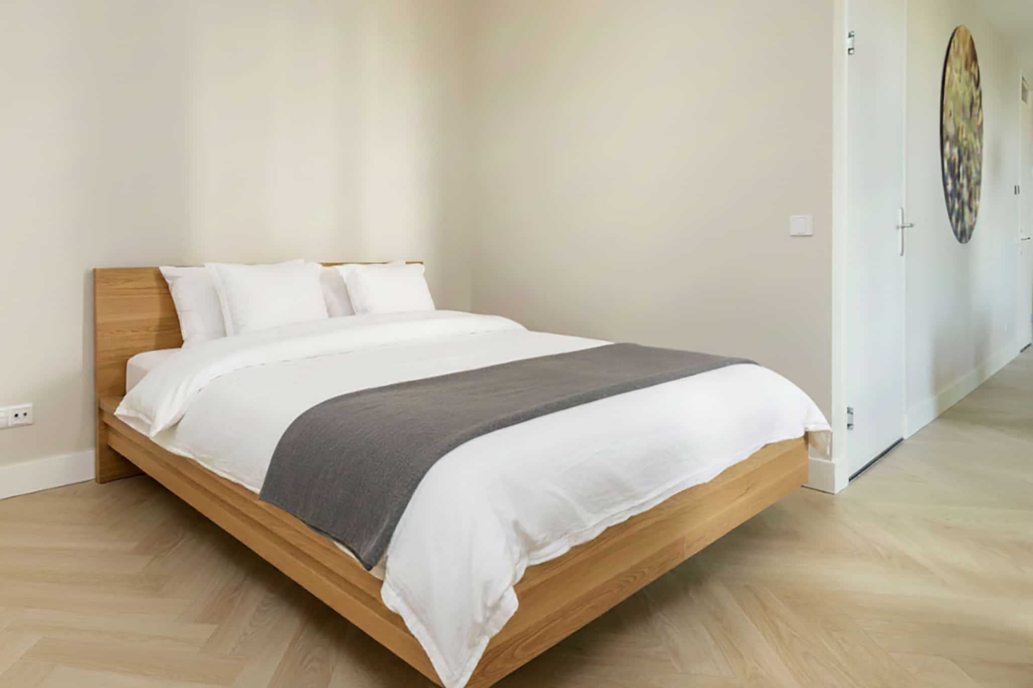 To the right of the living room you’ll find the bedroom, upgraded during construction for that perfect finish. And the view? Overlooking the city centre and St. Dionysius Church – the kind of view that makes waking up feel romantic every day.