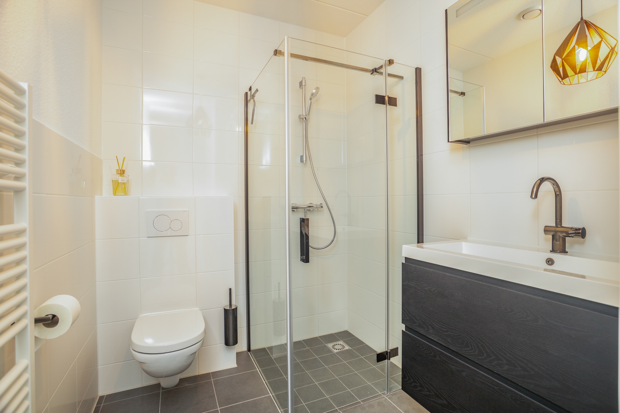 Clean white tiles, a modern hanging toilet, a walk-in shower, and a sink. Bright, efficient and ready to use.