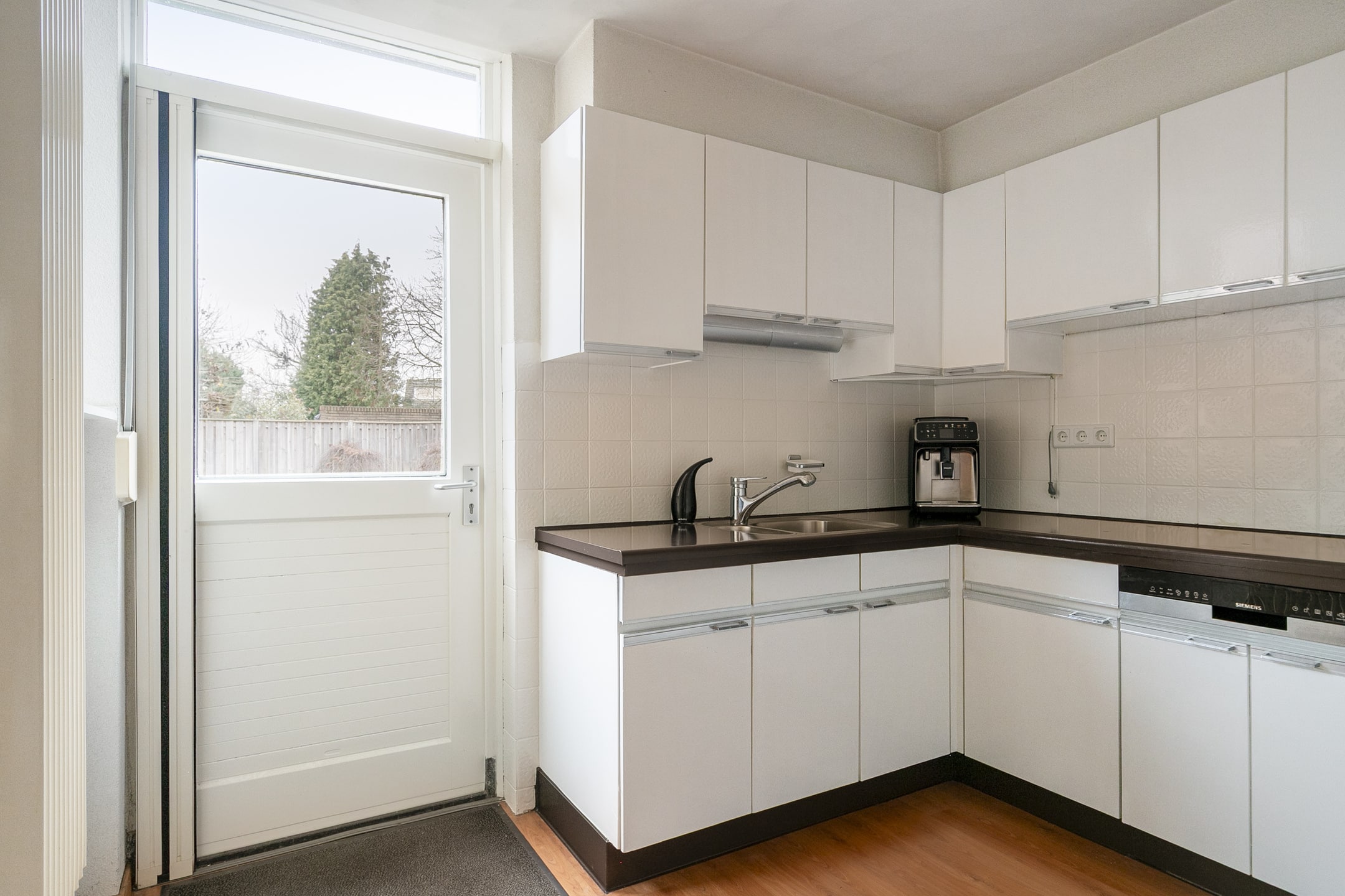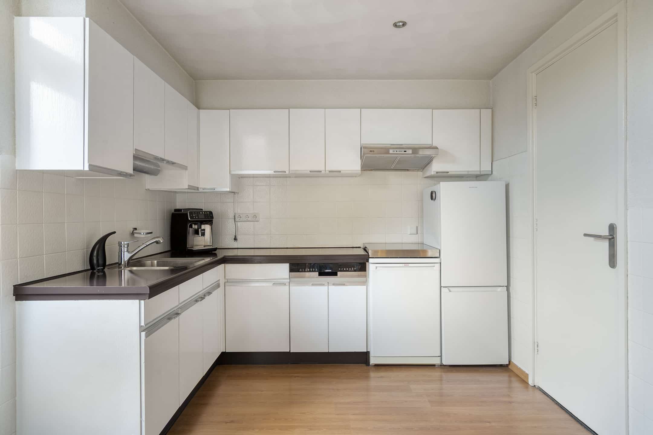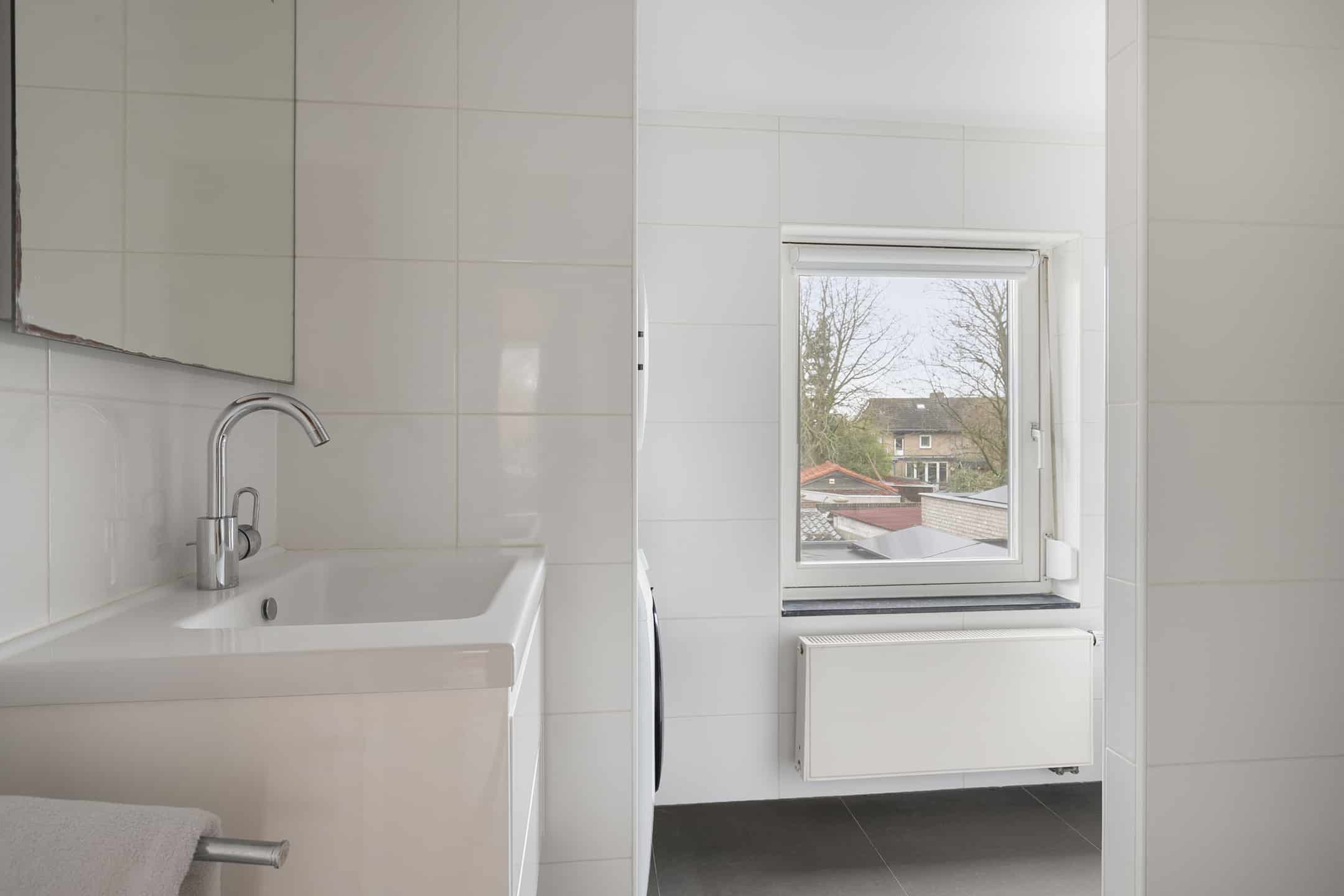 The kitchen is centrally positioned and offers a practical layout with a view of the backyard. From here, you have direct access to the huge garage/practice space — perfect for self-employed professionals, creatives, or hobbyists. The large double doors make the space ideal for storage, bikes, a workbench, or an atelier.