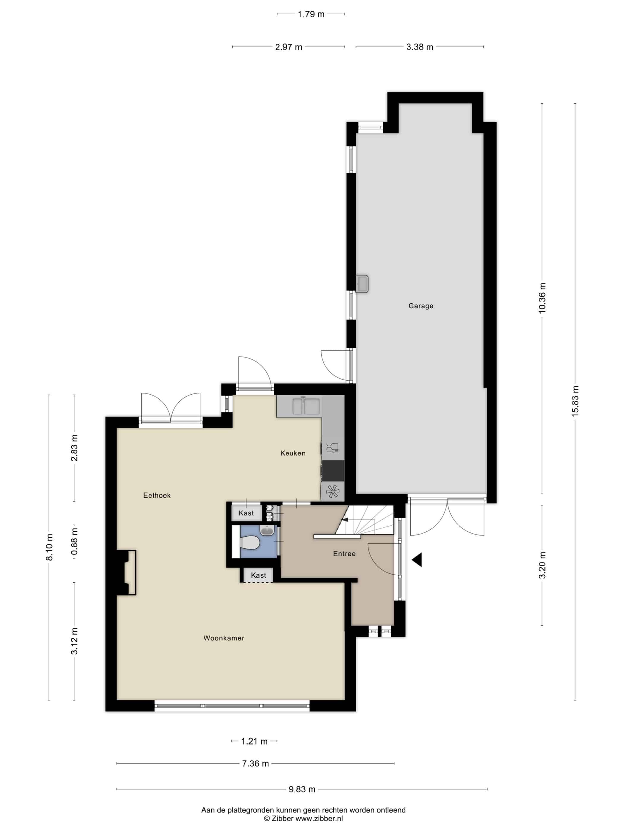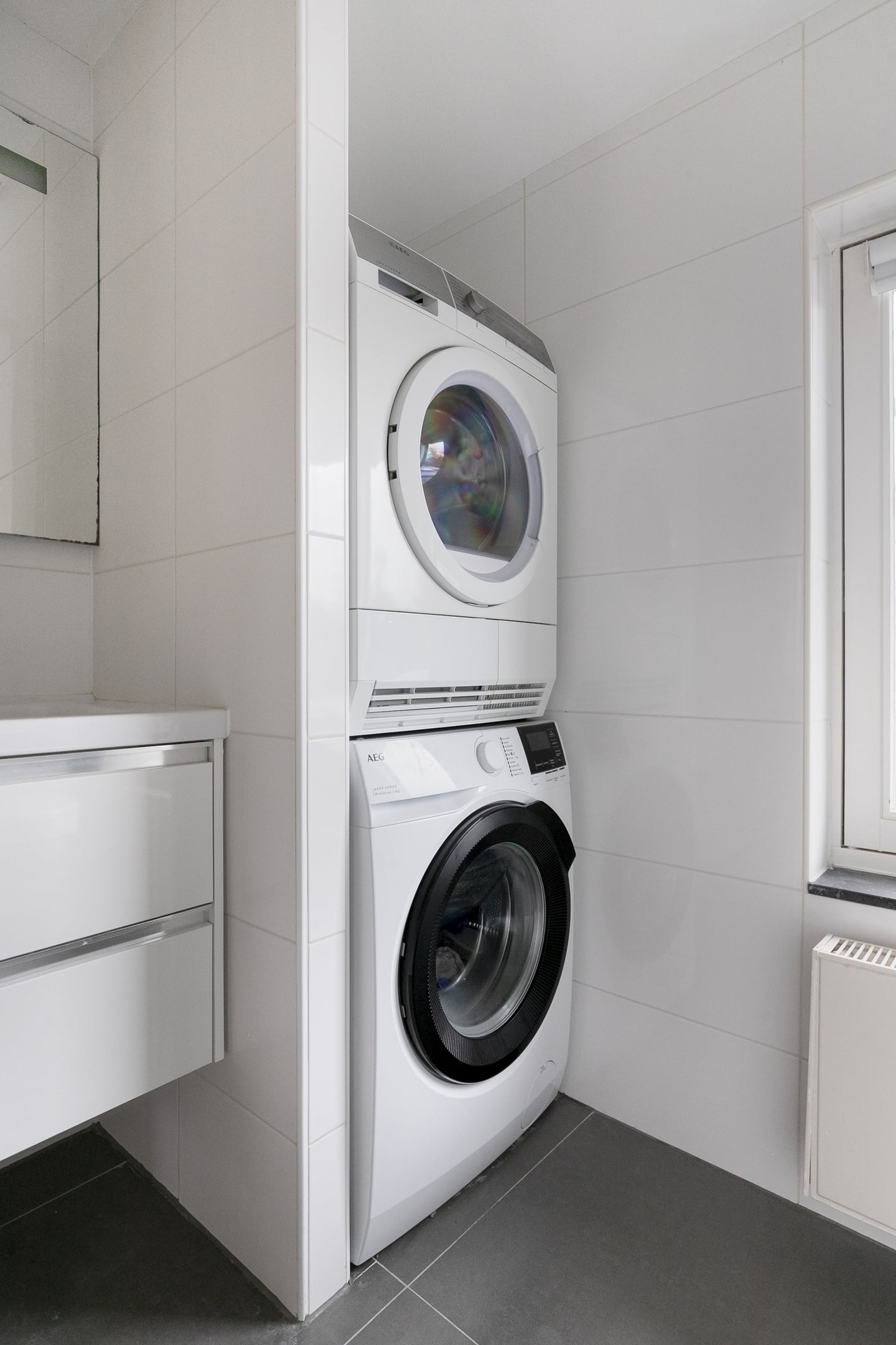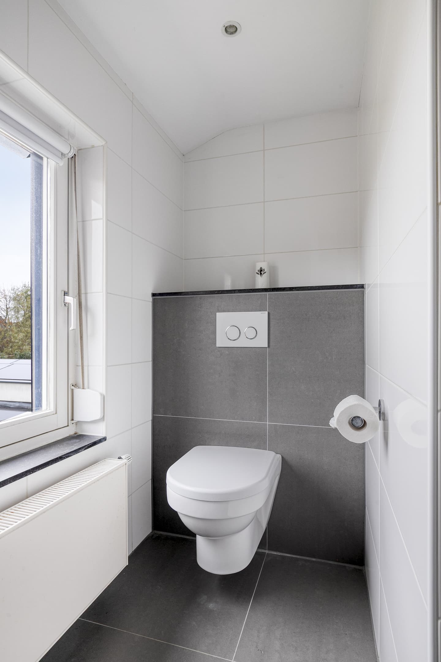 The kitchen is centrally positioned and offers a practical layout with a view of the backyard. From here, you have direct access to the huge garage/practice space — perfect for self-employed professionals, creatives, or hobbyists. The large double doors make the space ideal for storage, bikes, a workbench, or an atelier.