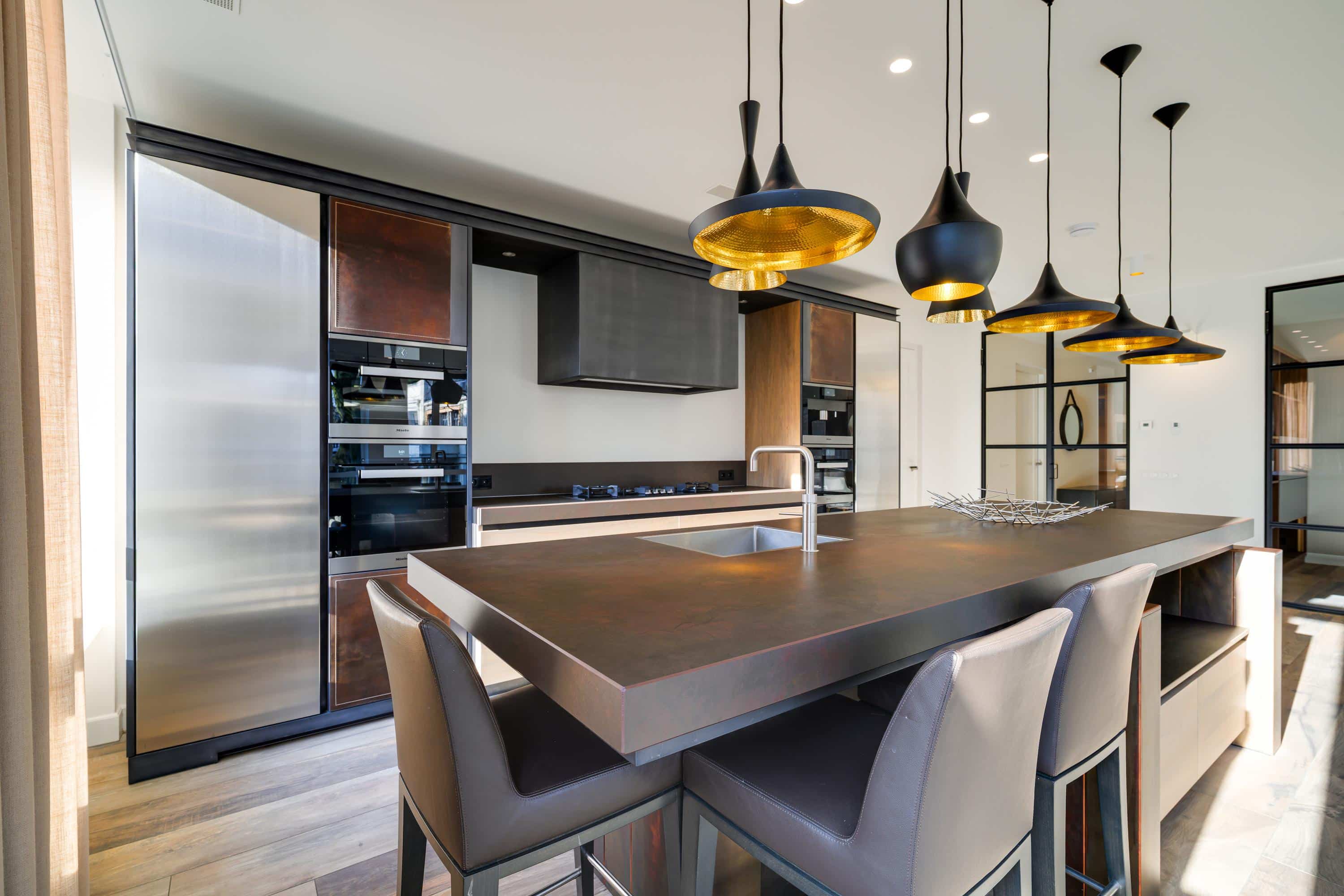 At the centre of the living space is a fantastic kitchen equipped with all the luxury Miele appliances, such as a steam oven, combi oven, wine climate cabinet, large refrigerator and separate freezer, and a kitchen island with a Quooker. This kitchen has been designed with an eye for detail and finished with high-quality materials, including special accents such as leather upholstery.