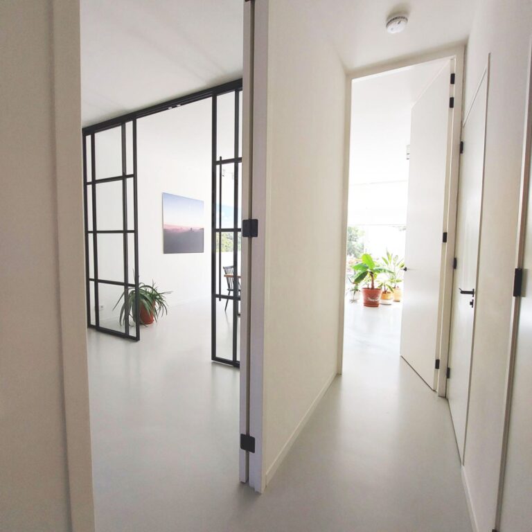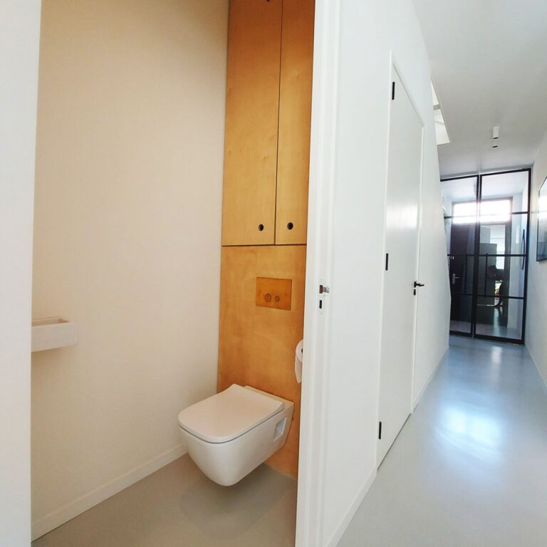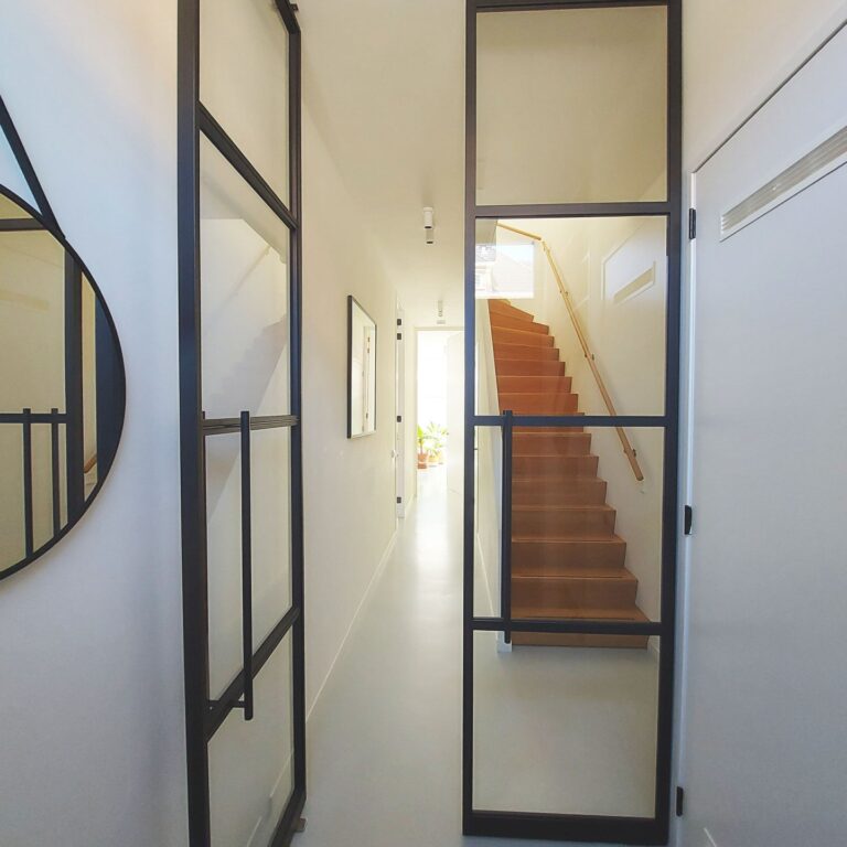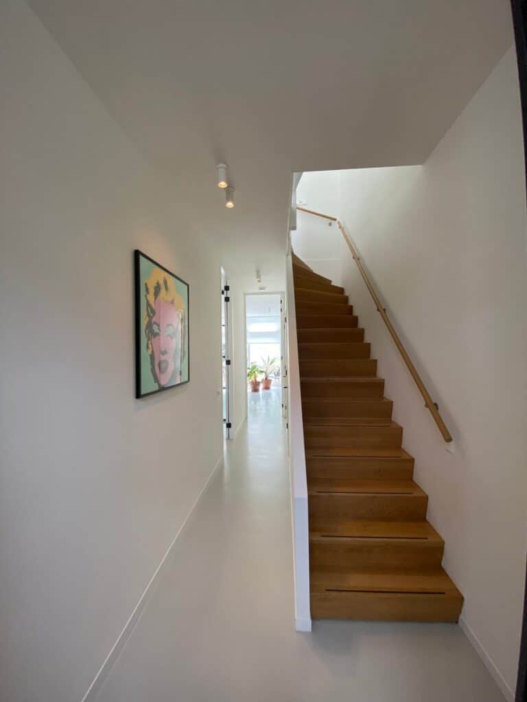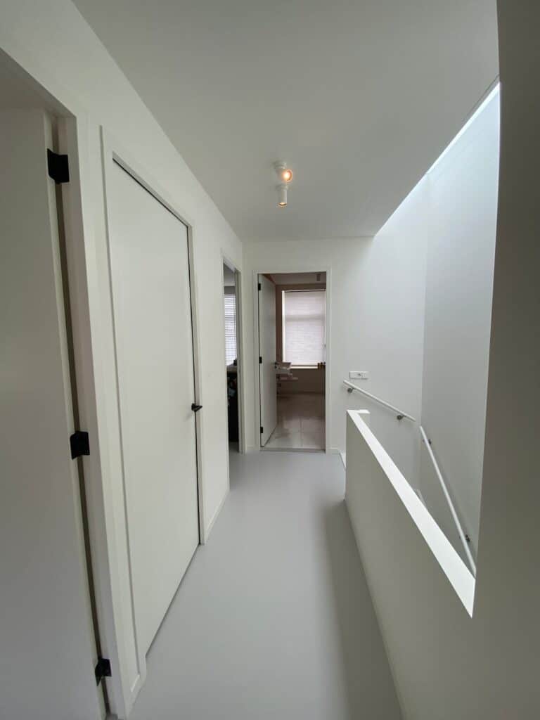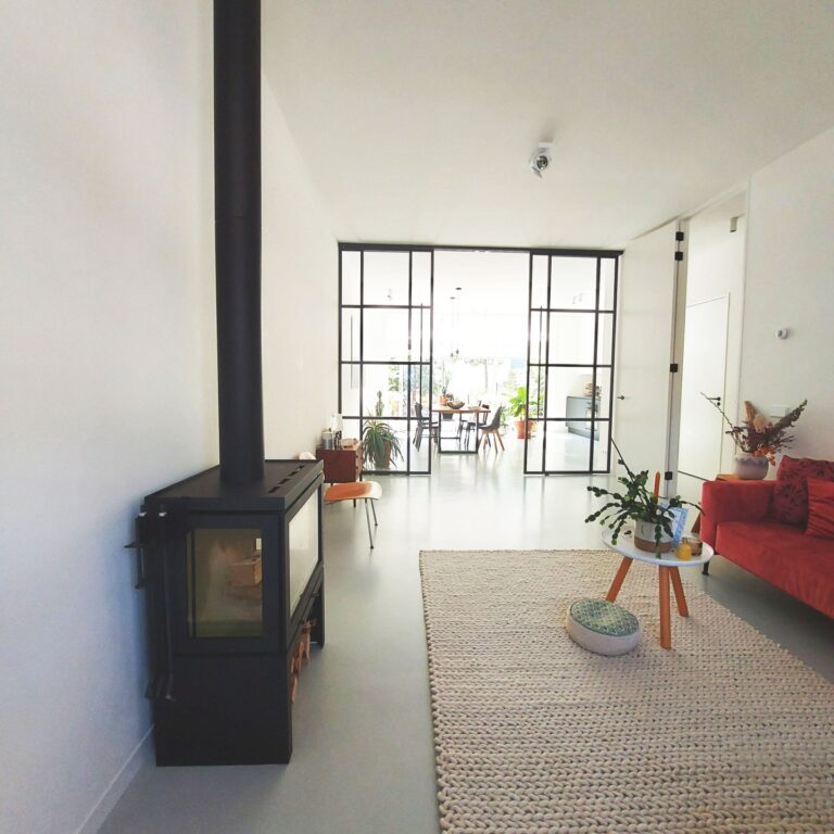 Entree met garderobe achter de deur en meterkast. Door 2 stalen taatsdeuren kom je in de hal met vanuit daar toegang tot de woonkamer, de keuken, toilet, bergruimte met losstaande vriezer en trap naar de 1e verdieping. De woonkamer ligt aan de voorzijde van de woning en is voorzien van een houthaard (voor de sfeer) en een gietvloer met vloerverwarming en is verbonden met schitterende stalen en-suite deuren met de ruime en luxe leefkeuken. De strakke keuken is voorzien van diverse inbouwapparatuur (inductie kookplaat, vaatwasser, oven, afzuigkap, koelkast en wijnkoelkast) en 3-delige schuifpui met toegang tot de tuin op het Zuiden (6 x 9).