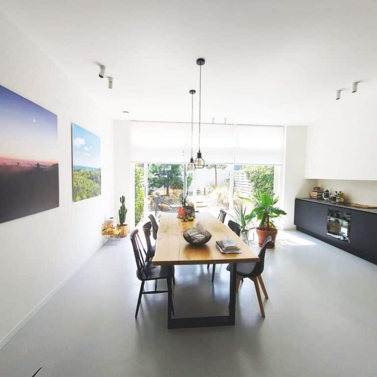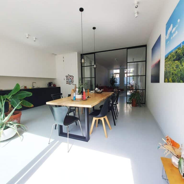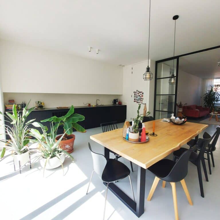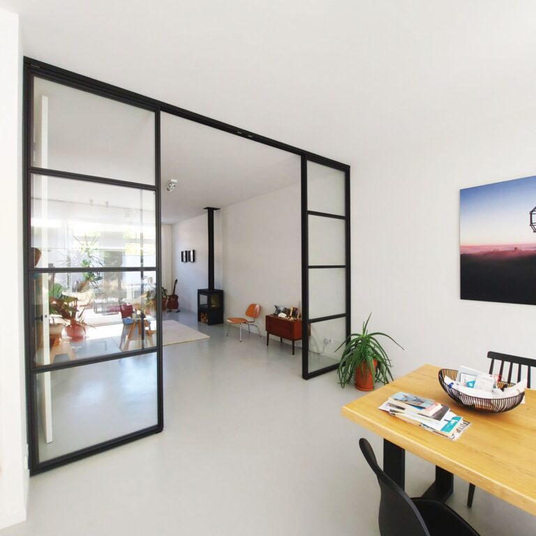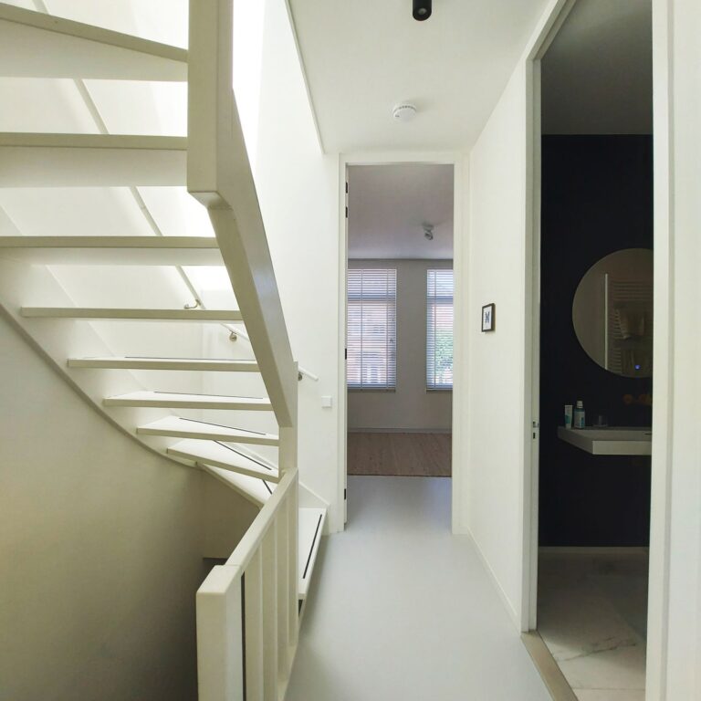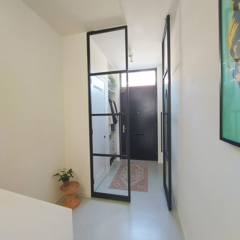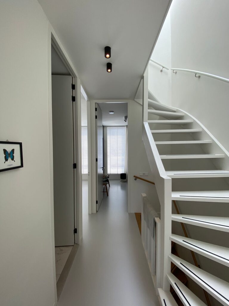 Entree met garderobe achter de deur en meterkast. Door 2 stalen taatsdeuren kom je in de hal met vanuit daar toegang tot de woonkamer, de keuken, toilet, bergruimte met losstaande vriezer en trap naar de 1e verdieping. De woonkamer ligt aan de voorzijde van de woning en is voorzien van een houthaard (voor de sfeer) en een gietvloer met vloerverwarming en is verbonden met schitterende stalen en-suite deuren met de ruime en luxe leefkeuken. De strakke keuken is voorzien van diverse inbouwapparatuur (inductie kookplaat, vaatwasser, oven, afzuigkap, koelkast en wijnkoelkast) en 3-delige schuifpui met toegang tot de tuin op het Zuiden (6 x 9).