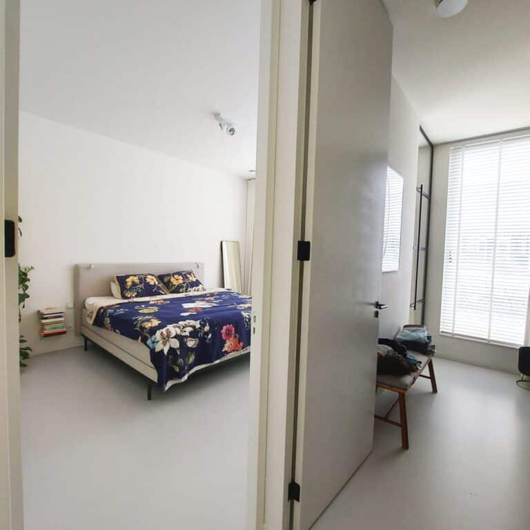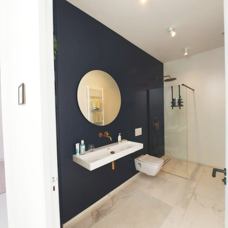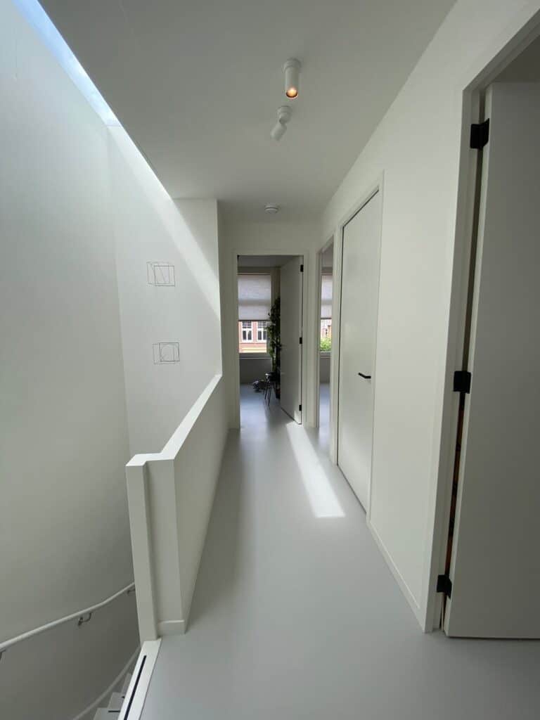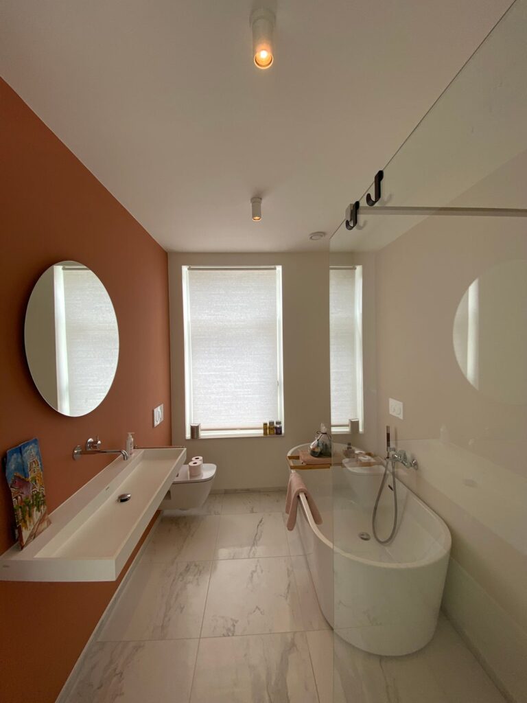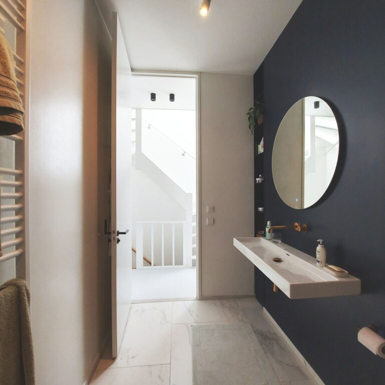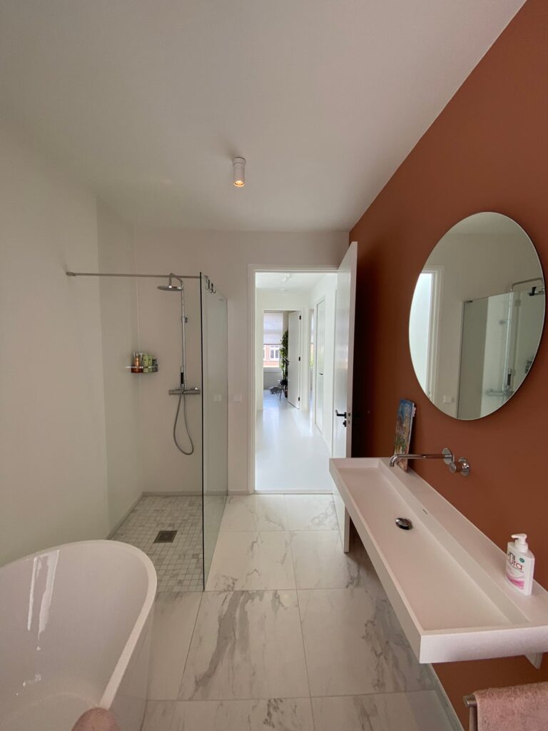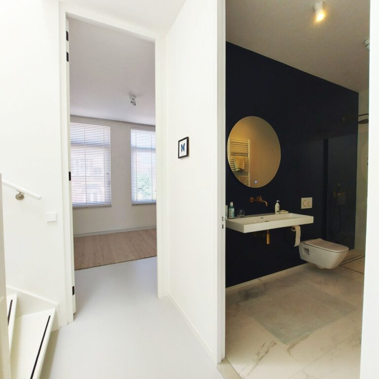 Overloop. Zeer ruime slaapkamer aan voorzijde. Luxe badkamer met inloopdouche, hangend toilet en wastafel. Ruime slaapkamer aan de achterzijde met een walk-in closet en toegang tot het dakterras (Zuiden).