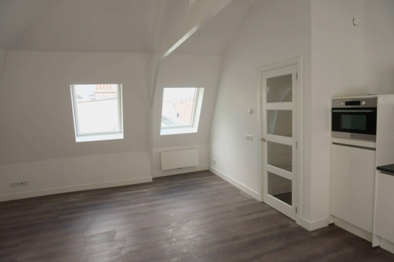 Gezamenlijke entree met intercom. Trap naar tweede etage. Entree appartement. Ruime hal met toegang tot WC met fonteintje. Badkamer voorzien van inloopdouche en wastafel. Ruime woonkamer van 35m2 voorzien van laminaat vloer. Open keuken met diverse inbouw apparatuur waaronder koelkast, vaatwasser, combi oven en keramische kookplaat. Ruime slaapkamer van 13m2. Ruime berg vide boven het appartement.