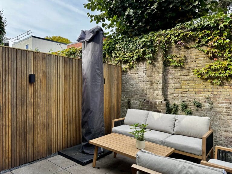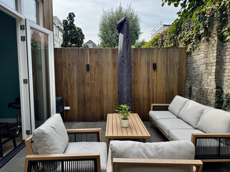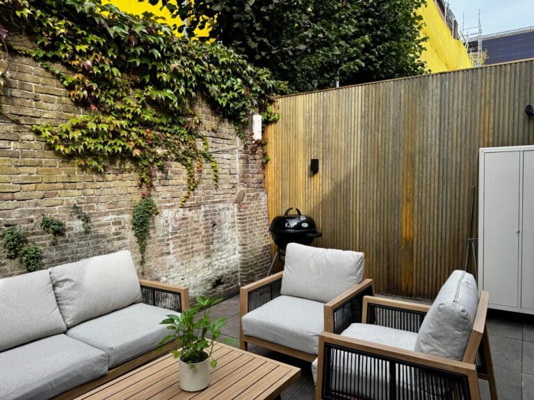 Openslaande deuren naar de achtertuin. Deze is voorzien van hoogwaardige louncheset.