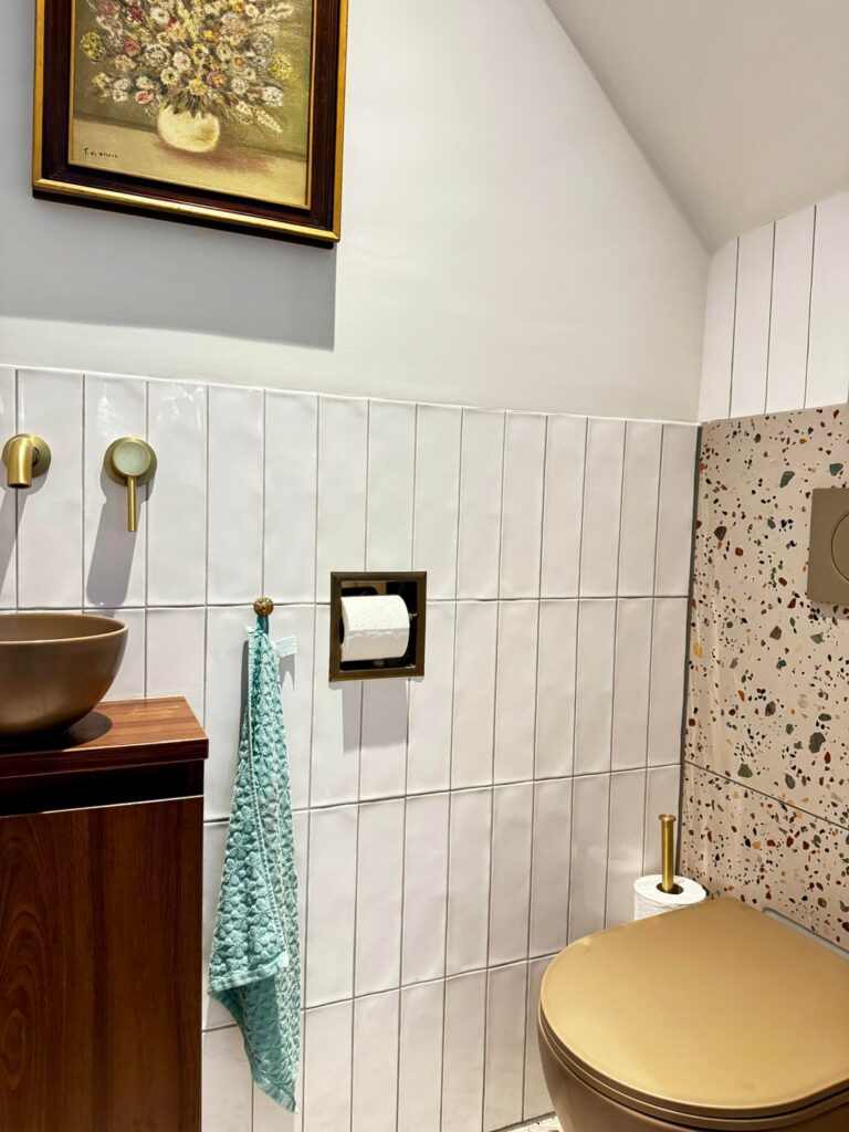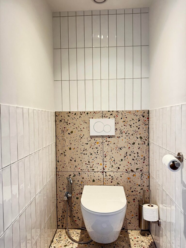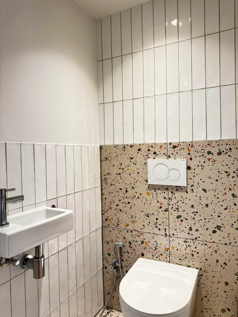 Entree, hal met toilet ruimte voorzien van zwevend design toilet en fonteintje.
