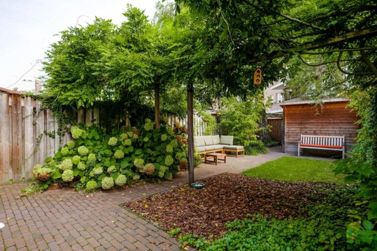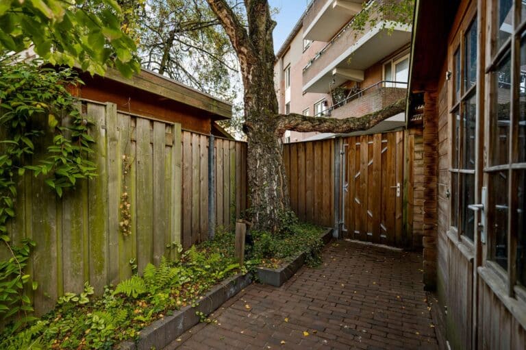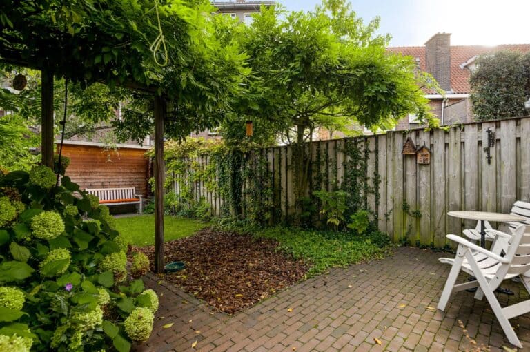 De diepe achtertuin is verzorgd aangelegd met gazon, borders, sfeervolle verlichting en bestrating. Achterin staat een houten berging met elektra, en dankzij de eigen achterom is de tuin ook via de achterzijde bereikbaar. De tuin is gelegen op het noordoosten, waardoor je gedurende de dag op meerdere plekken in de tuin van de zon kunt genieten.