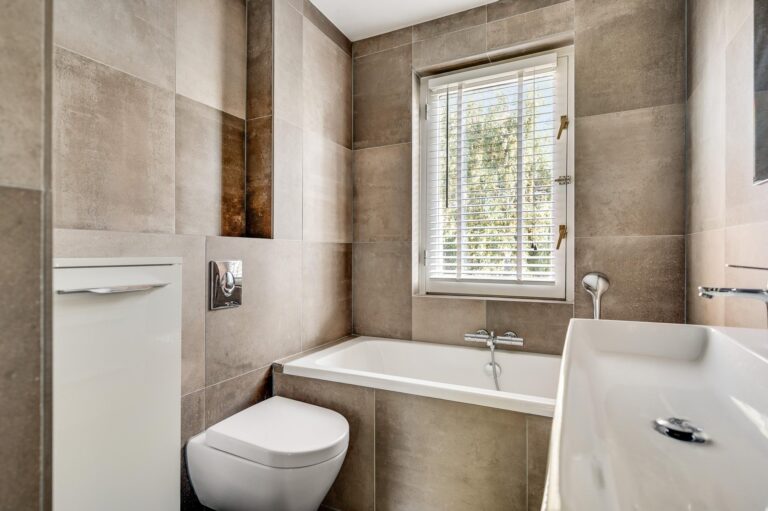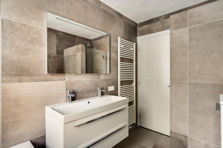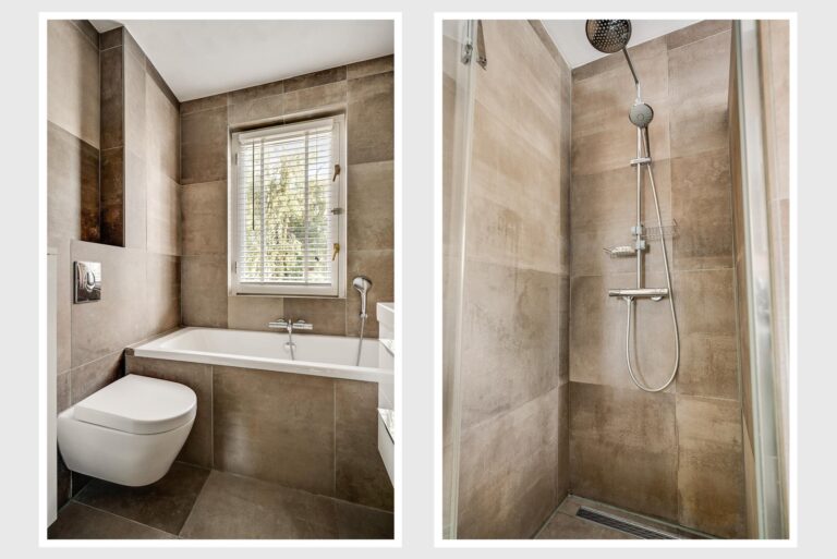 De luxe badkamer is geheel betegeld en voorzien van alle comfort: een ligbad, inloopdouche, dubbele wastafel, tweede toilet, designradiator en elektrische vloerverwarming.