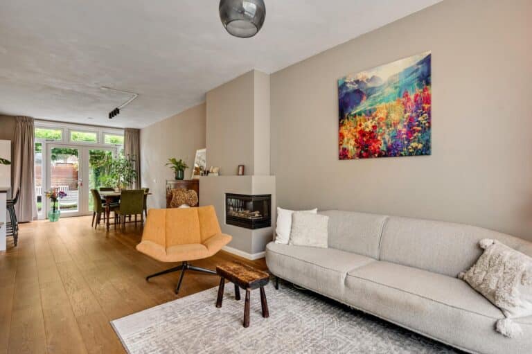 De royale woonkamer ademt sfeer met een warme eikenhouten vloer, een stijlvolle gashaard en openslaande tuindeuren naar de zonnige achtertuin.