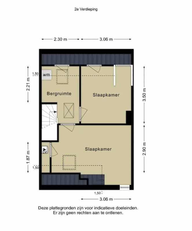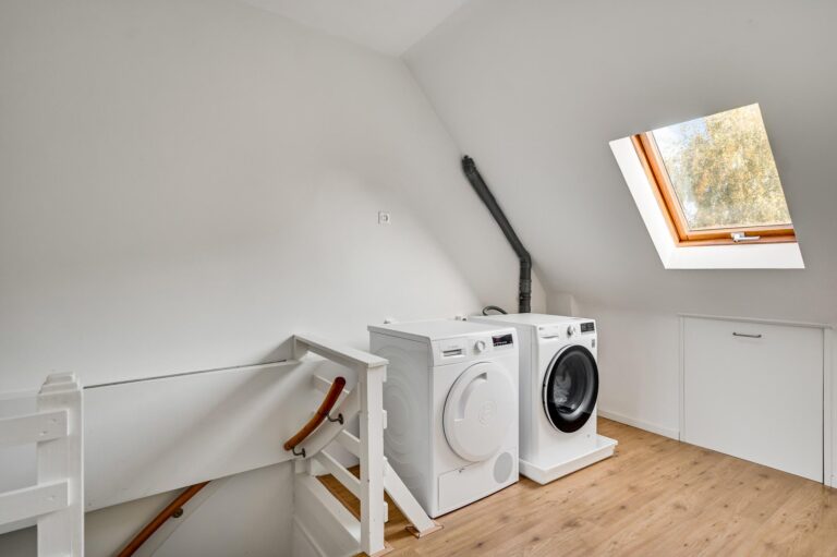 Via een vaste trap bereik je de overloop met wasmachineaansluiting, dakraam en praktische bergruimte.