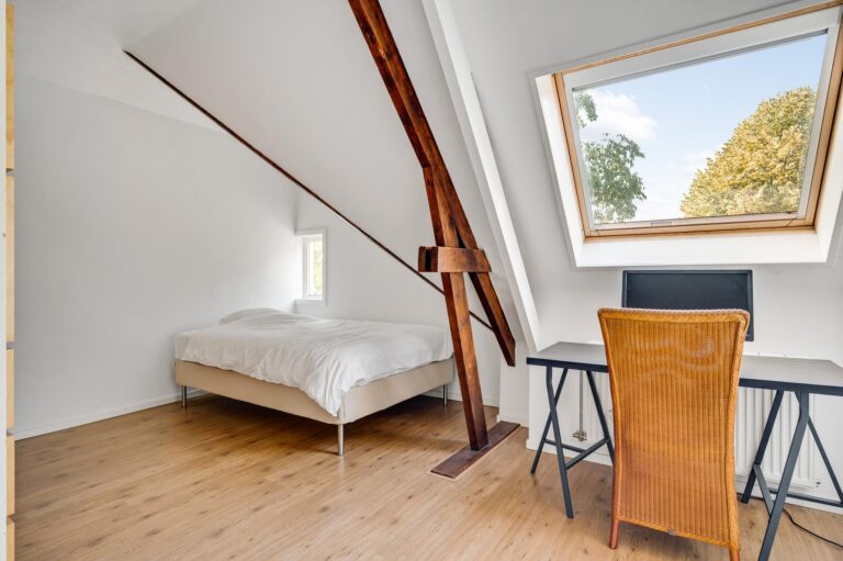 Hier bevinden zich nog twee volwaardige slaapkamers: één aan de voorzijde met dakraam, de ander aan de achterzijde met een dakkapel. Beide kamers beschikken over extra bergruimte achter knieschotten.