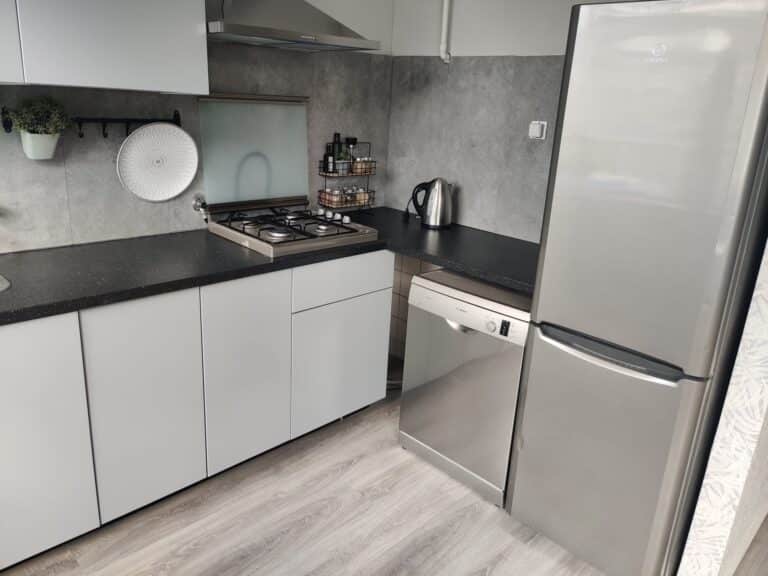 Open keuken voorzien van koelkast, vriezer, vaatwasser, combimagnetron, afzuigkap en gaskookplaat.
