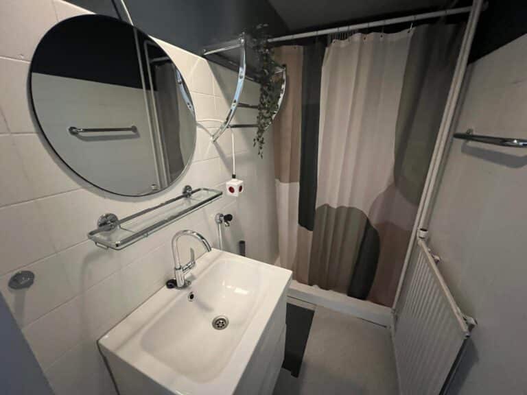 Badkamer voorzien van wastafel, douche en wasmachineaansluiting.
