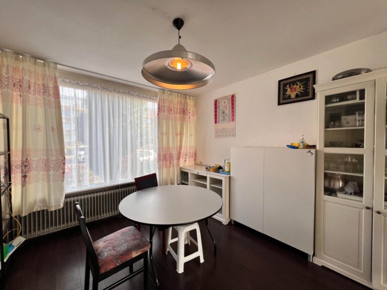 - Begane grond: Via de voortuin bereikt u de entree. De lichte woonkamer is voorzien van een warme laminaatvloer, een comfortabele lederen bank en een grote raampartij met uitzicht op de tuin. De dichte keuken in lichte kleurstelling beschikt over een gaskookplaat, afzuigkap en een wasmachine (Bosch). Vanuit de keuken is er direct toegang tot de diepe, groene achtertuin. Het toilet op de begane grond is recentelijk vernieuwd en zeer stijlvol afgewerkt.