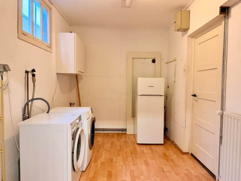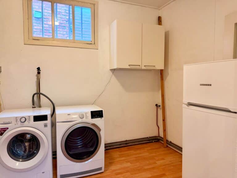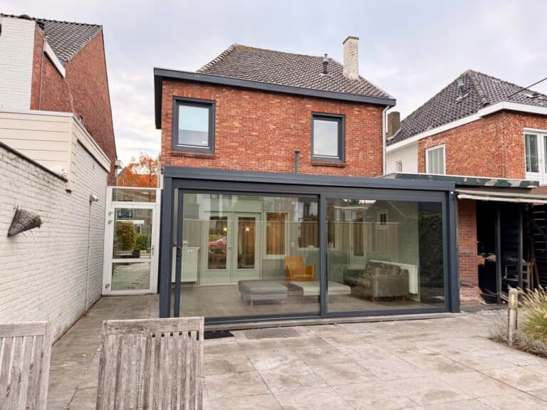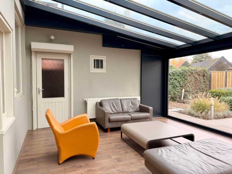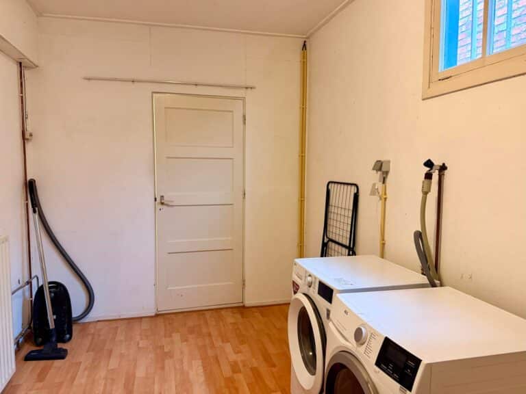 Bij binnenkomst komt u in de ruime hal, die toegang geeft tot de woonkamer en de trap naar de eerste verdieping. De woonkamer strekt zich over de volledige diepte van de woning en heeft aan de voorzijde grote raampartijen met uitzicht op de straat. Aan de achterzijde zorgen openslaande deuren voor een prettige overgang naar de serre, waardoor er veel daglicht binnenkomt. Vanuit de woonkamer is de keuken bereikbaar, die is uitgerust met diverse inbouwapparatuur, voldoende kastruimte biedt en toegang heeft tot de kelder voor extra opslag. Via het tussenportaal bereikt u het toilet, de bijkeuken met wasmachine, droger en koelkast, en de royale serre van circa 30 m². De serre, met glazen dak en schuifpui, geeft toegang tot de achtertuin.