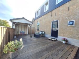De achtertuin is ruim, heeft een mooie houten vlonder en een schuurtje met afdak, ideaal voor een avondje barbecue.
