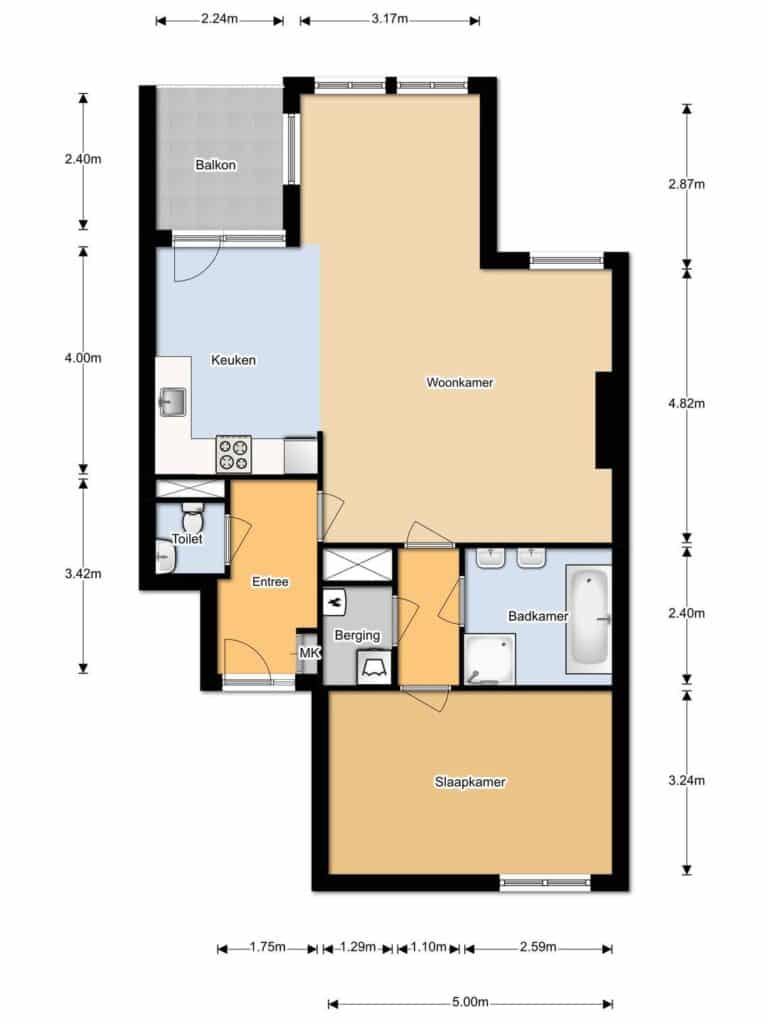 Indeling: entree, hal met apart toilet, een lichte woonkamer in open verbinding met de keuken en toegang tot het de loggia die gelegen is op het zuiden. De keuken in hoekopstelling is voorzien van gaskookplaat, afzuigkap, vaatwasser, koelkast, wijnkoeler en combioven. Via een tussenportaal is er toegang tot de royale slaapkamer, de badkamer met inloopdouche (regendouche en handdouche), een ligbad en een dubbele wastafel en de berging met aansluiting witgoed en opstelling cv-ketel.