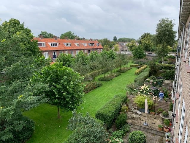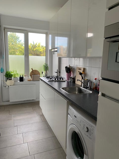 Entreehal, toegang tot ruime woonkamer onderverdeeld in eet en zit gedeelte, een aparte keuken v.v. apparatuur, een badkamer met douche en wastafel, een apart toilet, een slaapkamer ca. 12m2 met toegang badkamer en een slaapkamer van ca. 10m2. Het appartement beschikt over een balkon aan zowel de voorzijde als de achterzijde en een grote gemeenschappelijke tuin.