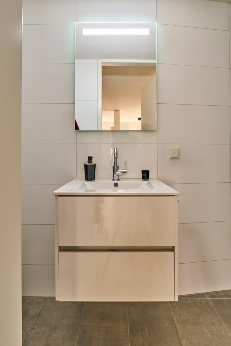 En dan de badkamer; deze is klein maar fraai en functioneel. Ook de badkamer is recent geplaatst en dus ook volledig nieuw. De badkamer bestaat uit een WC met hangtoilet, een wastafelmeubel, een designradiator en een (regen)douche.