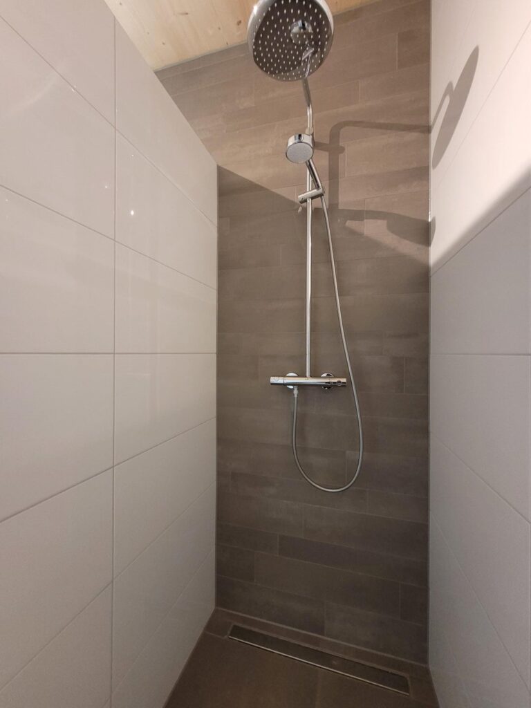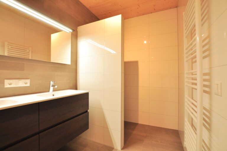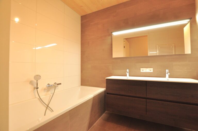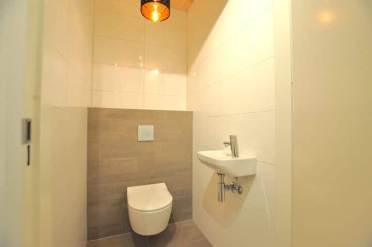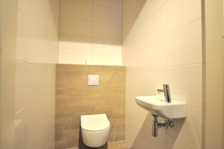 Aan de overzijde van de hal vindt u de badkamer. Deze beschikt over een fraai ligbad en een breed opgezette inloopdouche. Tussen beiden treft u een dubbele wastafel met ombouw. Het toilet is separaat te bereiken vanuit de hal.