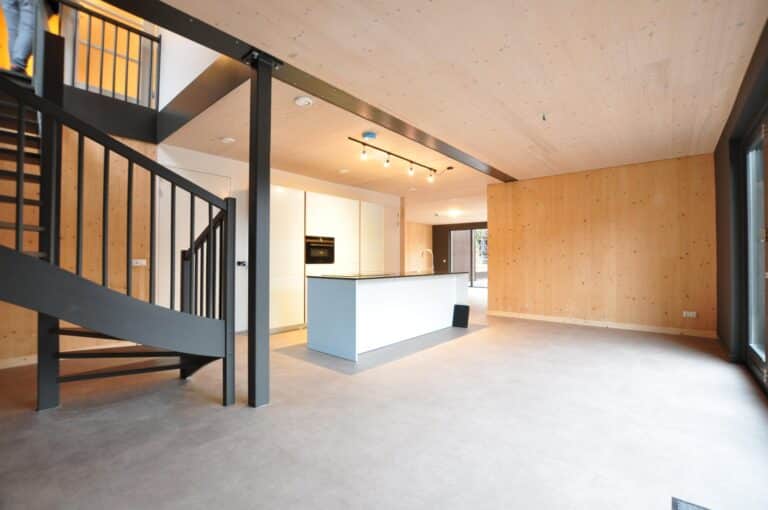 Royale woonkamer in Z-vorm, uitgerust met moderne PVC tegels in lichtgrijze kleurstelling, omring door de unieke CLT houten wanden. De open keuken met kookeiland siert de ruimte, en is uitgerust met facetten zoals een 4-pits inductie met Bora afzuigsysteem, een koelkast, vriezer, vaatwasser en een magnetron-oven combinatie.