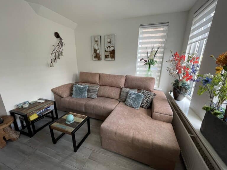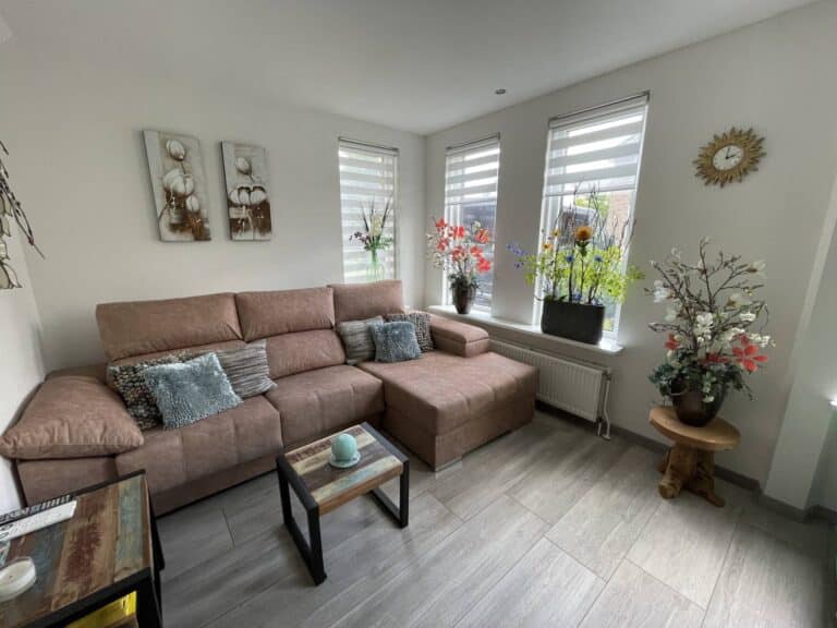 De woonkamer kenmerkt zich door veel lichtinval. De relaxhoek is voorzien van loungebank, fauteuil, elektrische haard, flat screen tv en sfeervolle decoraties.