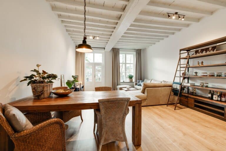 laminaatvloer (brede delen, houtmotief) en de originele hoge (dubbele) ramen.