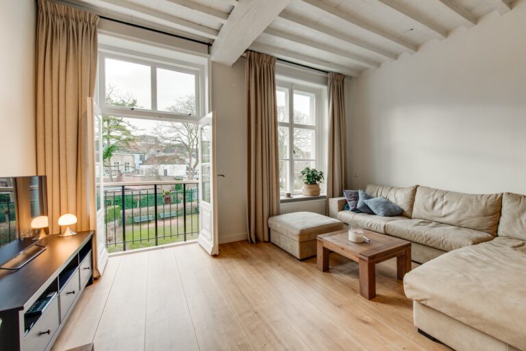 Royale woonkamer met prachtig zicht op de Merkxtuin, is afgewerkt met een laminaat vloer (brede delen, houtmotief), hoog plafond afgewerkt met balken (hoogte ca. 3.20m), sfeervolle hoge ramen en openslaande deuren naar het Franse balkon. In de woonkamer bevindt zich de videofoon.