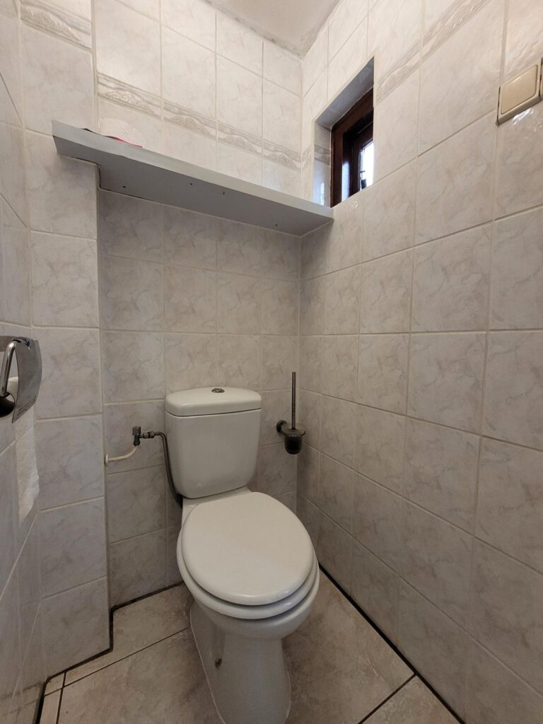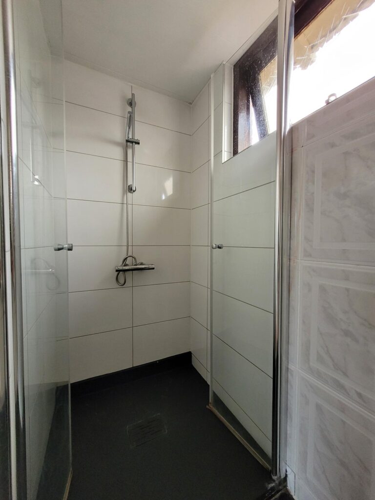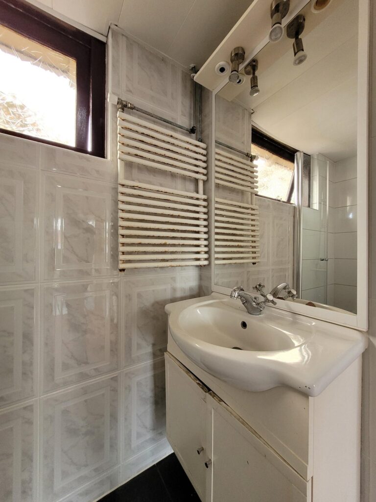 De badkamer ligt aan de voorzijde, en beschikt over een inloopdouche en wastafel met ombouw.