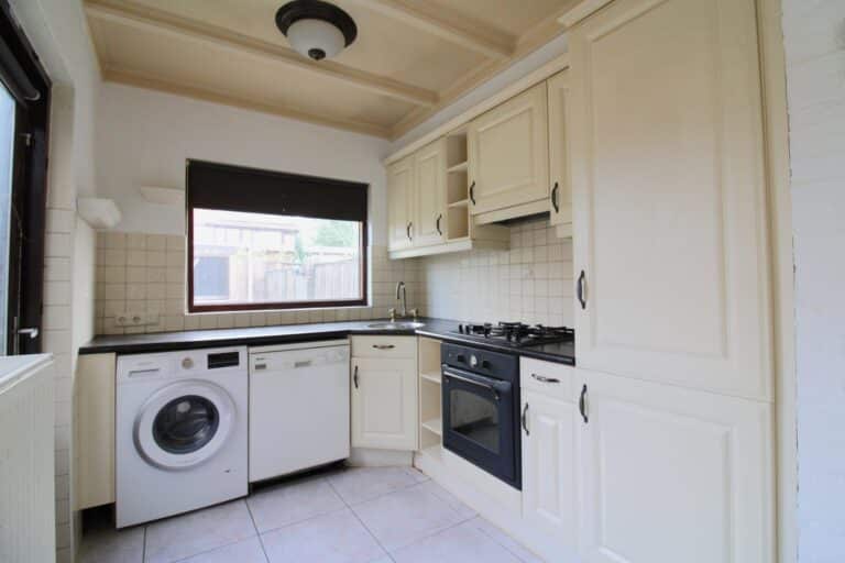 Woonkamer in Z-vorm, beschikkende over een tegelvloer en ramen aan weerszijden. Vanuit de woonkamer kunt u de open keuken bereiken, welke beschikt over een koelkast, vriezer, 4-pits gasfornuis, vaatwasser en oven (deze wordt vervangen voor een nieuw model). Ook treft u de wasmachine in de keuken.