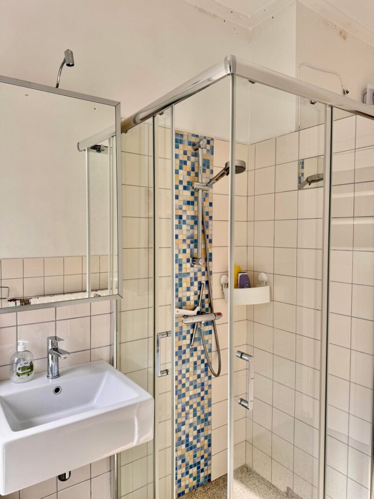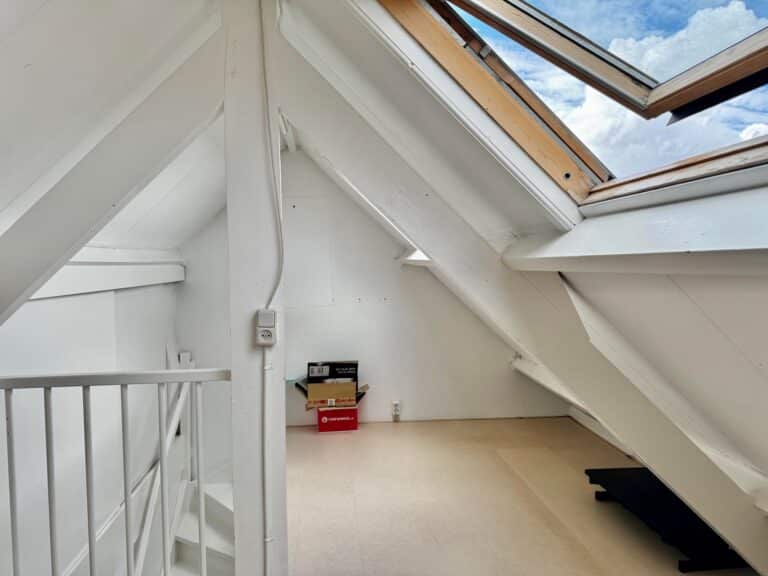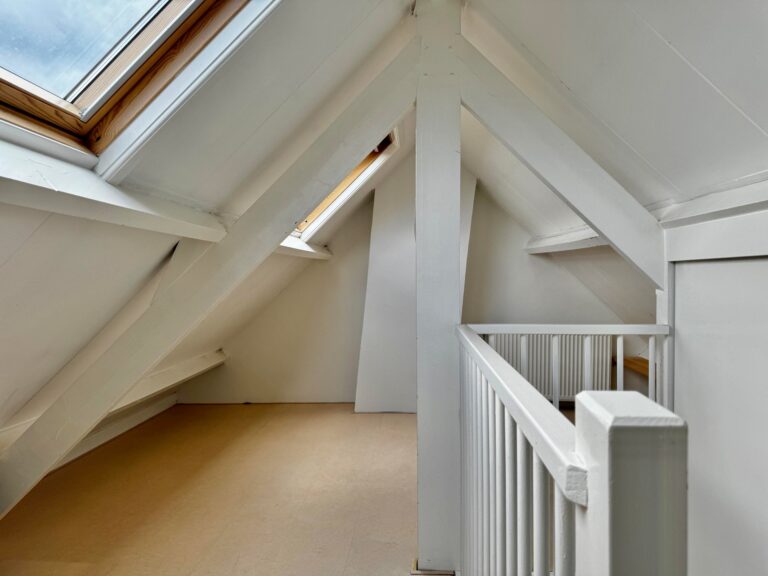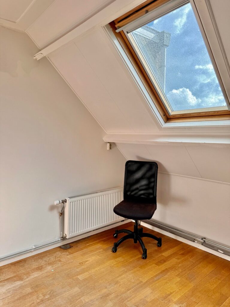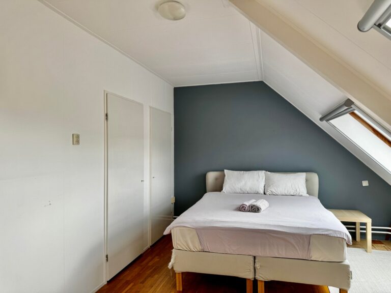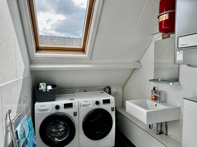 Overloop. Ruime slaapkamer aan de voorzijde over de volle breedte. Kleinere kamer aan de achterzijde. Wasruimte met wastafel, wasmachine, droger en douchecabine. Trap naar zolder etage met zolderkamer.