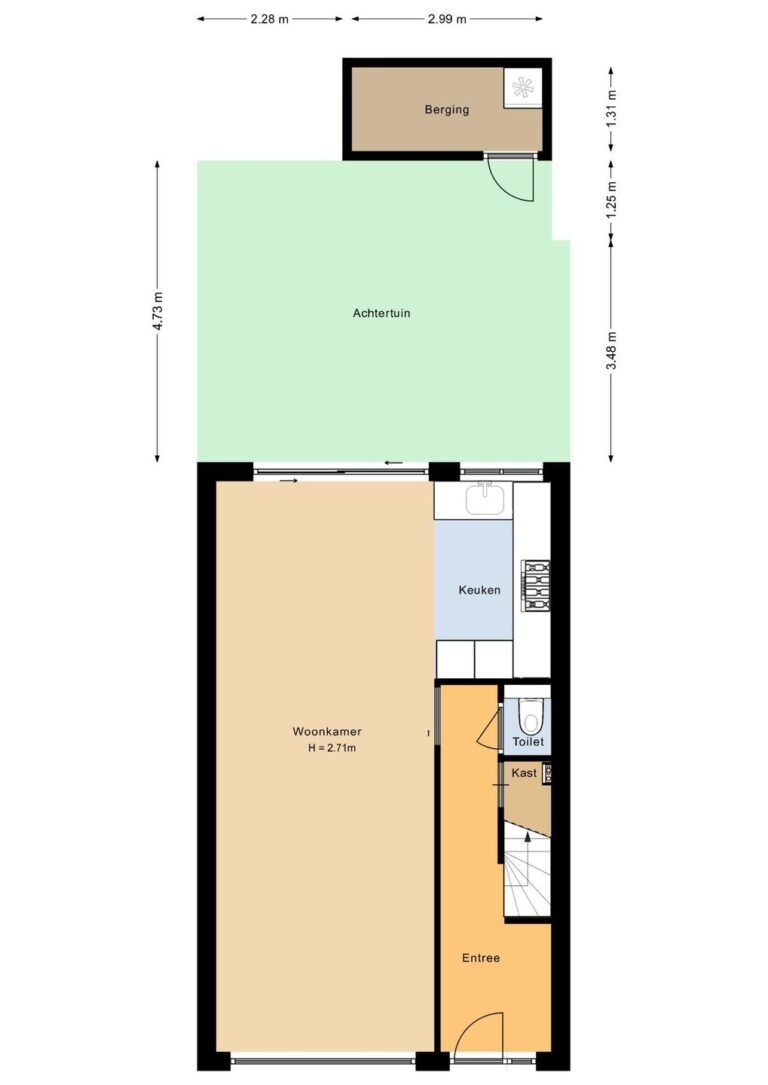 Entree woning. Hal met garderobe. Toilet. Woonkamer met schuifpui naar de achtertuin op het zuiden. Berging van 4m2. Openkeuken voorzien van inbouw apperatuur, zoals: formuis, vaatwasser, afzuigkap en koel vries combinatie.