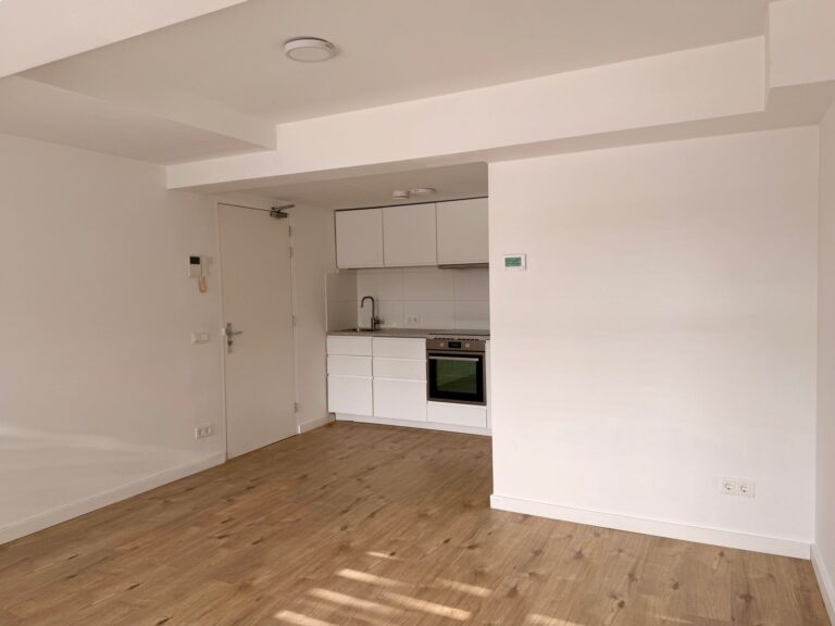 Entree direct in de studio met een grote raampartij aan de voorzijde, waardoor de ruimte heerlijk licht is en uitzicht biedt op de straat. De open keuken is modern en volledig uitgerust met alle benodigde apparatuur, waaronder inductieplaat, combi-oven, vaatwasser, koel-vriescombinatie en voldoende kastruimte.