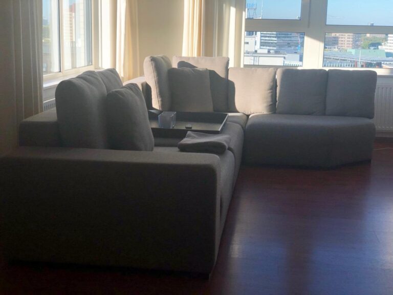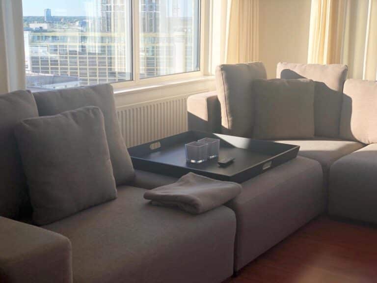 Ruime, luxe ingerichte living met fraai uitzicht over de stad, voorzien van een moderne zithoek en een eethoek.