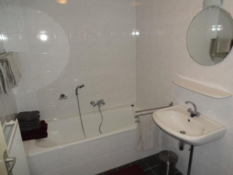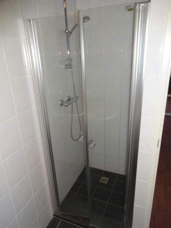 Luxe badkamer met aparte douchecabine en vaste wastafels.